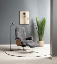 Lykke fåtölj och fotpall i mörkgrått fårskinn är både elegant och bekväm, vilket gör den perfekt för avkoppling. Fåtöljen har mjuka former, borstad metallfot och sidor av ek. Med sina funktioner såsom steglös lutning av rygg och med återsnurr blir Lykke den perfekta fåtöljen för vardagsrummet eller läshörnan.