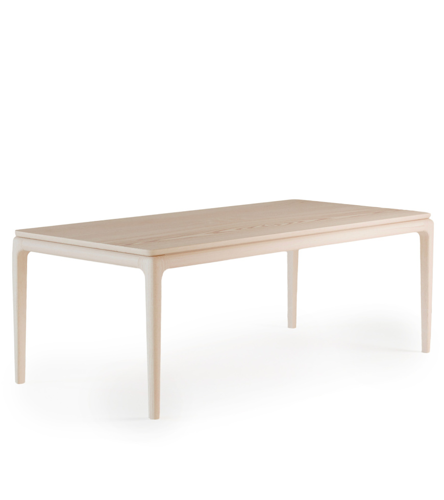 Detta matbord i massiv varmvitoljad ask kombinerar skandinavisk enkelhet med eleganta detaljer. Bordets design kännetecknas av mjuka och organiska fogar som framhäver det naturliga träets vackra struktur. Den upphöjda toppplattan ger en lätt och svävande effekt, samtidigt som de rundade kanterna förstärker bordets mjuka uttryck.