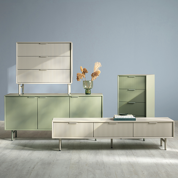 Vår förvaringsserie Plaza kombinerar modern design med genomtänkta detaljer för ett hem där form och funktion samspelar. Möbelserien är tillverkad i lackad metall och MDF och ger ett stabilt, kvalitativt uttryck som passar lika bra i det minimalistiska hemmet som i mer personliga inredningsstilar. De vågformade fronterna ger möblerna en mjuk och elegant karaktär, samtidigt som ben och handtag i lackad metall tillför ett sobert och stilrent intryck.