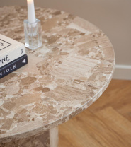 Soffbordet Naxos är tillverkat i lackad marmor i en elegant lattebrun nyans. Det har en sexkantig pelarfot som ger stabilitet och karaktär, medan den runda toppskivan skapar en mjuk kontrast till det kantiga underredet. Den naturliga marmorn ger varje bord en unik prägel, med variationer i färg och nyans som bidrar till dess levande och exklusiva uttryck.