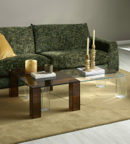 Detta soffbord i brunt härdat glas kombinerar modern elegans med en unik materialitet. Både bordsskivan och benen är tillverkade i samma vackert tonade glas, vilket skapar ett harmoniskt och enhetligt uttryck. Den bruna glastoningen ger värme och djup, samtidigt som den behåller glasets luftiga och moderna karaktär.