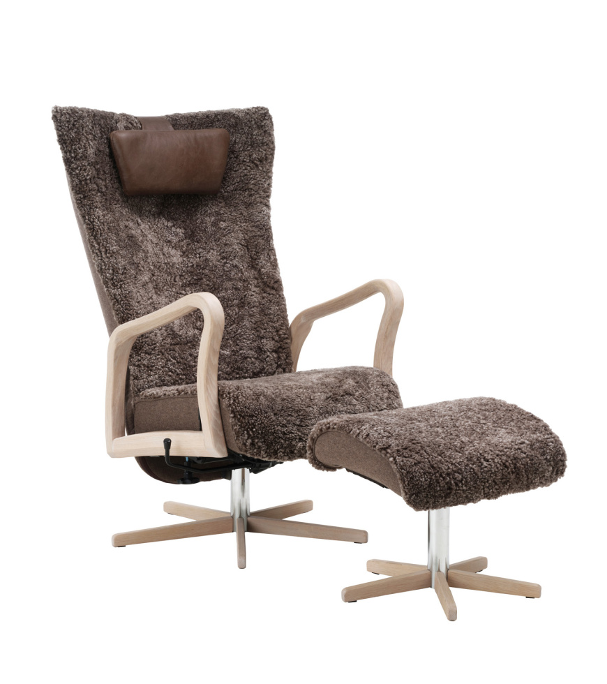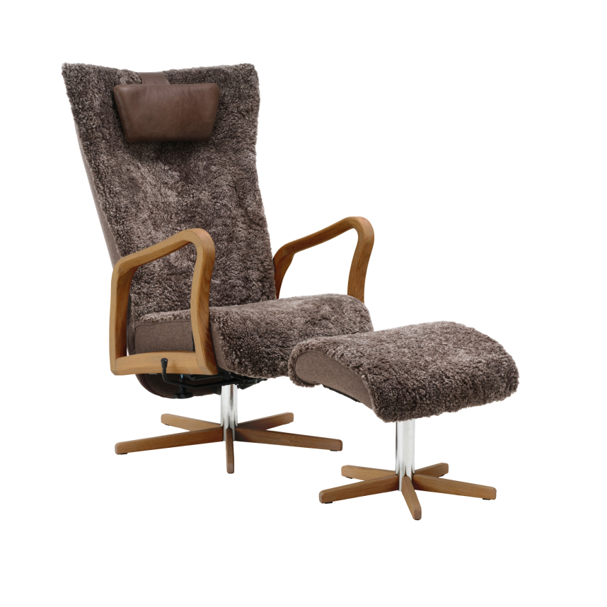 Fåtöljen är klädd i äkta fårskinn, valt för sin naturliga mjukhet, slitstyrka och höga komfort. Materialet skapar en behaglig sittupplevelse året runt och bidrar till en ombonad och exklusiv känsla i rummet. Fårskinn är ett levande naturmaterial, vilket innebär att variationer i struktur och färg förekommer och gör varje fåtölj personlig och unik.