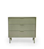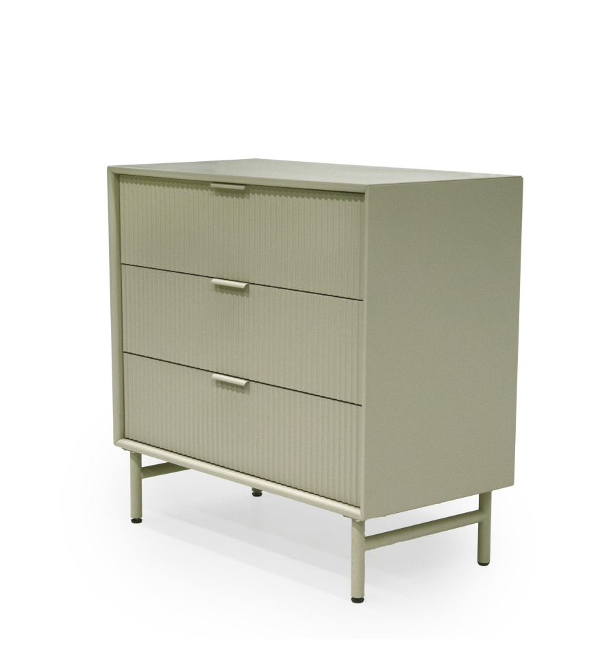 De vågformade fronterna ger möblerna en mjuk och elegant karaktär, samtidigt som ben och handtag i lackad metall tillför ett sobert och stilrent intryck. Lådorna är utrustade med fullutdrag och softclose, vilket gör förvaringen både smidig och tyst i vardagen. Monteringen av benen är genomförbar på ett lätt sätt.