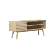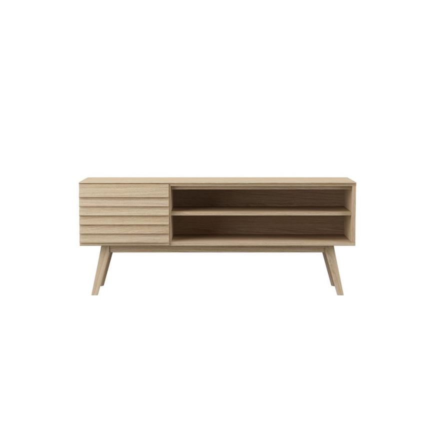 Denna stilfulla mediabänk i ek är en modern tolkning av de klassiska lamelluckorna, där designen fokuserar på mjuka linjer och sömlösa övergångar. De horisontella lamellerna ger ett tidlöst men uppdaterat intryck som passar perfekt i den skandinaviska inredningen.