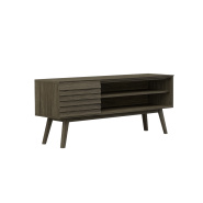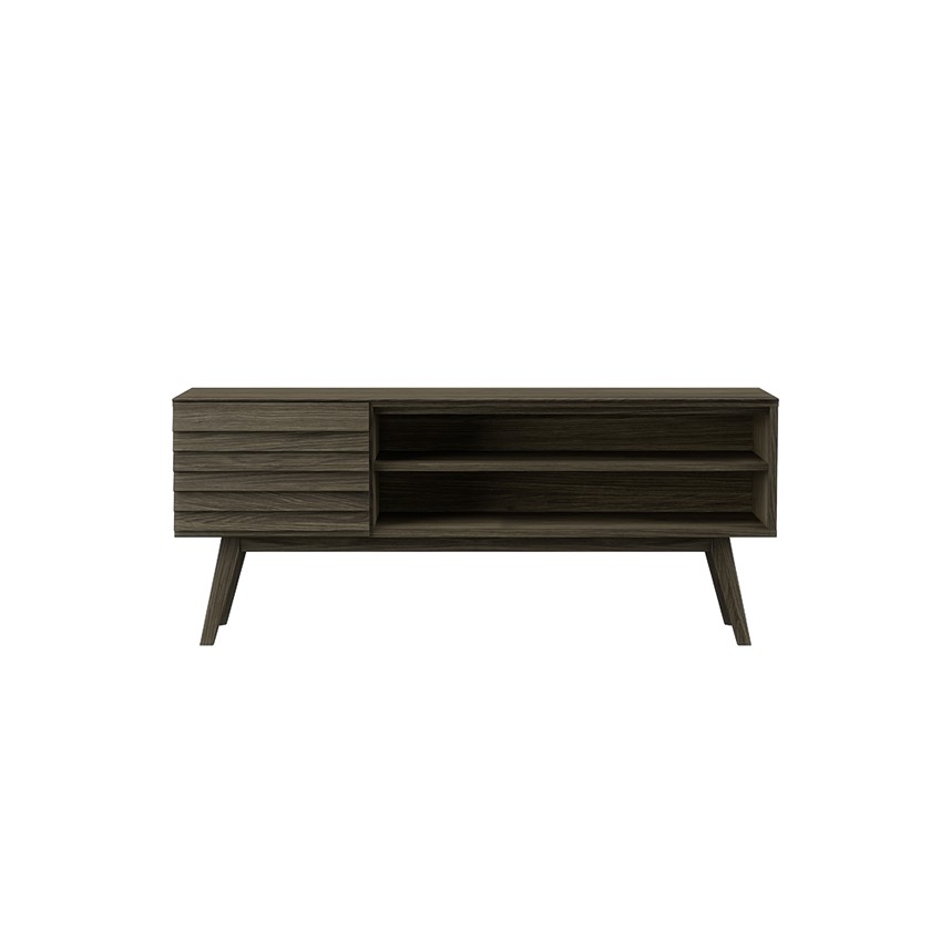 Bakom den lilla träluckan döljer sig ett förvaringsutrymme. Perfekt för att snabbt gömma undan småsaker. Den öppna sektionen bredvid delas av en flyttbar trähylla, vilket ger flexibilitet för att anpassa ytan efter behov. På baksidan finns ett praktiskt kabelhål som gör det enkelt att organisera teknik som spelkonsoler, router eller medieboxar utan synliga sladdar.