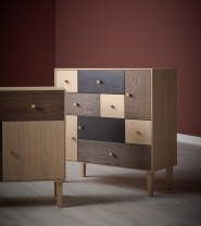 Sense byrå är en mångsidig möbel, både när det gäller färg och förvaring. Den har gott om utrymme med sina sex lådor och tre skåp. Fronterna är i vitgpigmenterad-, svartbetsad- och brunoljad ekfanér.