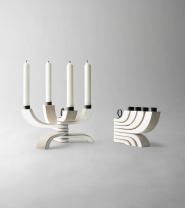 Designern Jonas Grundell har kombinerat släta träytor och matt lack med en svart järnögla som binder samman de olika delarna. När lamporna har brunnit ner kan man fälla upp ljusstaken som då tar minimalt med förvaringsutrymme.