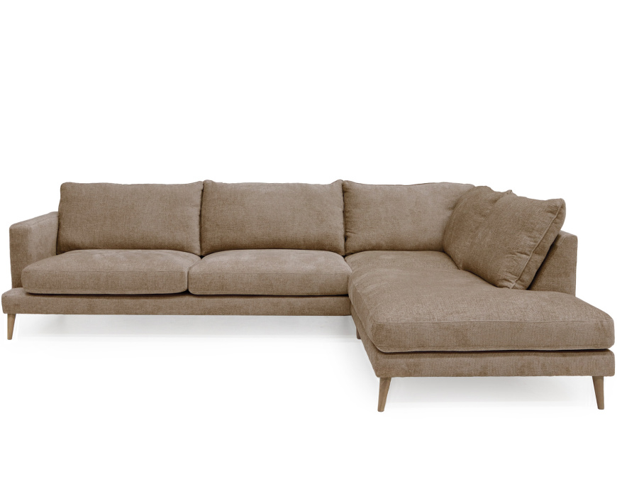 En modern och inbjudande hörnsoffa med ett öppet avslut som förenar stilren design med hög komfort och kvalitet. Med generösa mått och en ryggplymå fylld med kallskum och dun erbjuder den skön sittkomfort för avkoppling. Varje detalj är omsorgsfullt utformad för att säkerställa hållbarhet och en stilfull känsla som varar i många år.