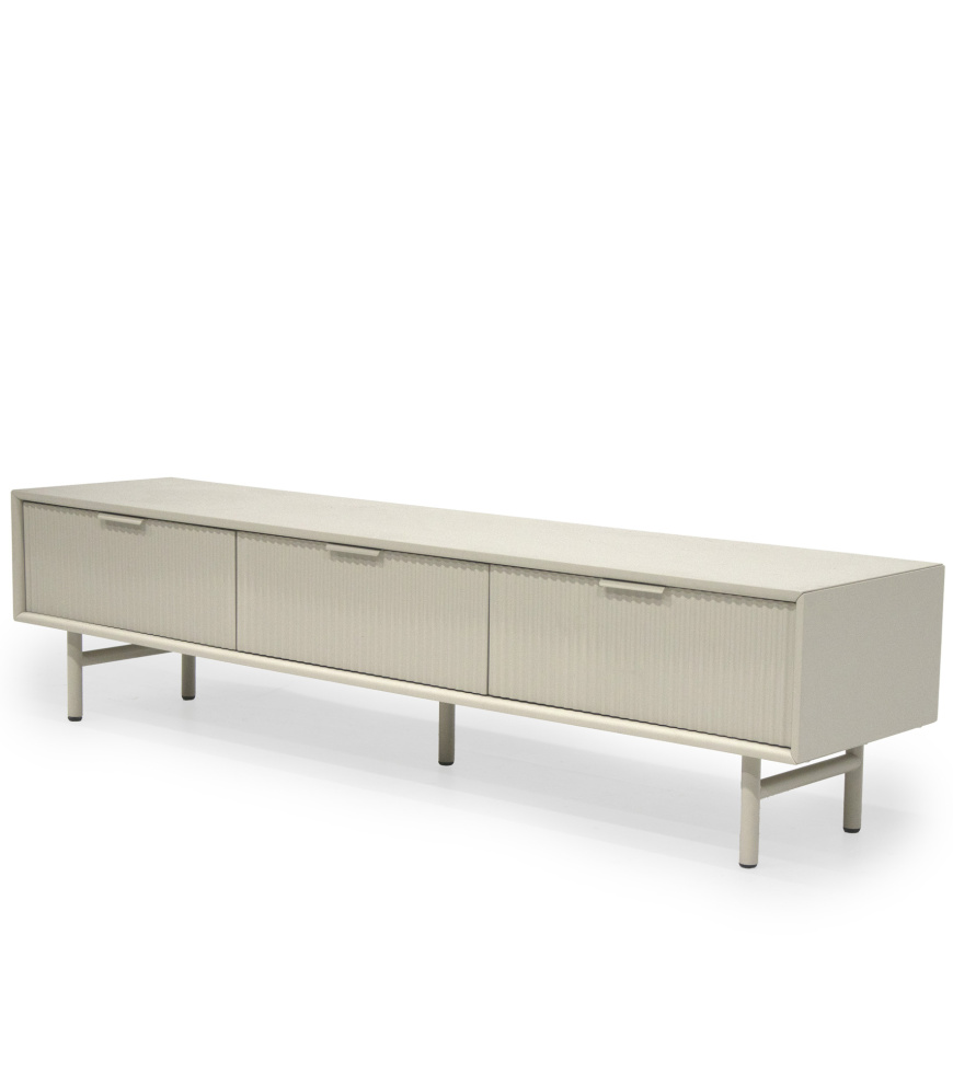 Denna mediabänk i vår förvaringsserie Plaza kombinerar modern design med genomtänkta detaljer för ett hem där form och funktion samspelar. Möbelserien är tillverkad i lackad metall och MDF och ger ett stabilt, kvalitativt uttryck som passar lika bra i det minimalistiska hemmet som i mer personliga inredningsstilar.